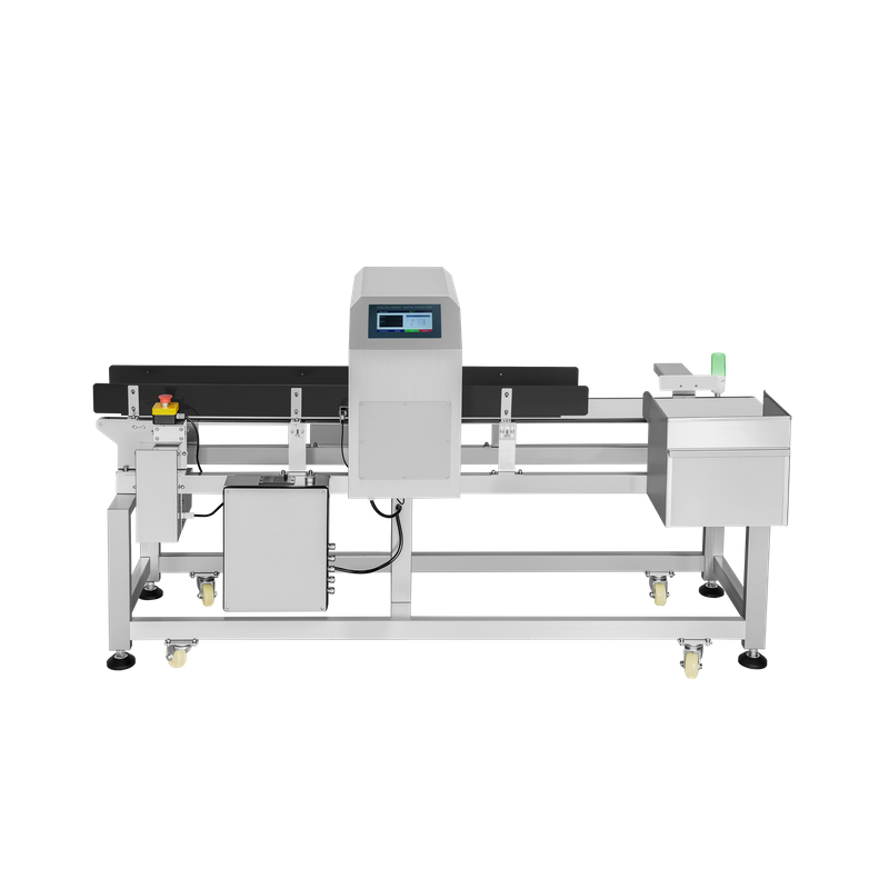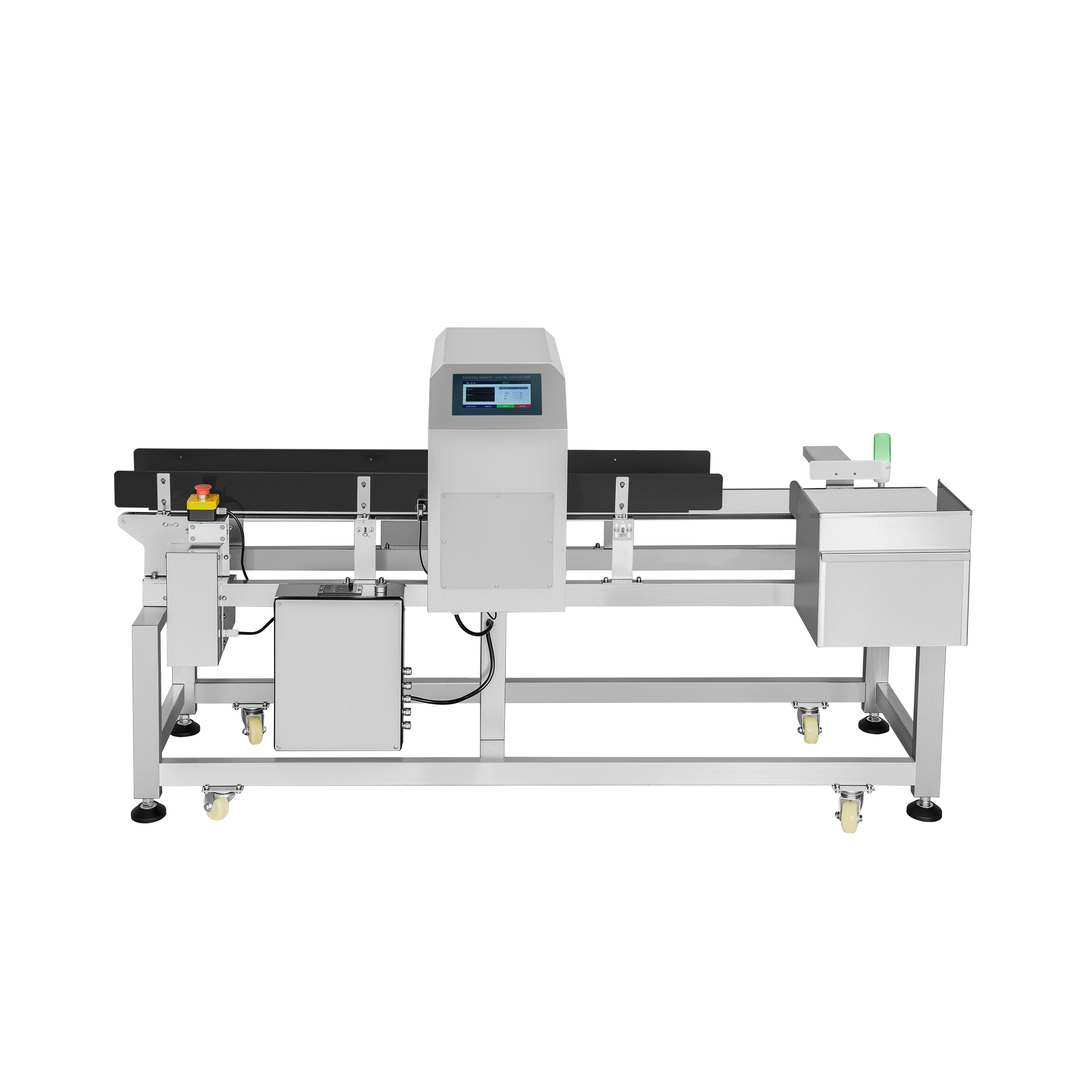 Der Metalldetektor kann verschiedene Metallverunreinigungen wie Eisen, Kupfer, Aluminium und Edelstahl erkennen, die in Rohstoffe eingemischt sind. Die Pusher-Ausschleusung eignet sich für mittelgroße Produkte wie z. B. Taschenprodukte Taschentücher, Kosmetiktücher in einer Box, kleines verpacktes Pulver, oder andere Pakete wie dieses.